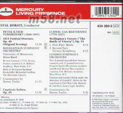 這款《1812序曲》錄音為美國水星唱片公司在1958年獲得第一個金唱片獎,安塔爾·多拉蒂(Mercury Antal Dorati)指揮美國明尼阿波利斯交響樂團(tuán)(Minneapolis Symphony Orchestra,現(xiàn)已改名為明尼蘇達(dá)管弦樂團(tuán))的演繹,靠的就是它非凡的音效以及撼人心脾的炮聲,這也是首度在唱片錄制中使用真實(shí)炮聲,直至五十年后的今天,這一版本的錄音依然是發(fā)燒友追捧的對象。