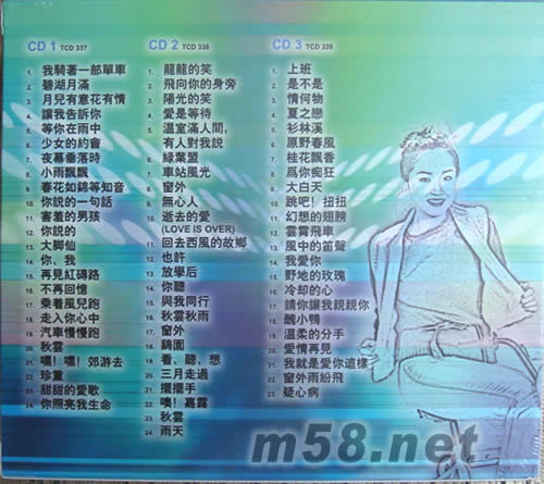 CD 1 TCD 337 01. 我騎著一部單車 02. 碧湖月滿 03. 月兒有意花有情 04. 讓我告訴你 05. 等你在雨中 06. 少女的約會 07. 夜幕垂落時 08. 小雨飄飄 09. 春花如錦等知音 10. 你說的一句話 11. 害羞的男孩 12. 你說的 13. 大腳仙 14. 你 我 15. 再見紅磚路 16. 不再回憶 17. 乘著風兒跑 18. 走入你心中 19. 汽車慢慢跑 20. 秋云 21. 嘿!嘿!郊游去 22. 珍重 23. 甜甜的愛歌 24. 你照亮我生命 CD 2 TCD 338 01. 龍龍的笑 02. 飛向你的身旁 03. 陽光的笑 04. 愛是等待 05. 溫室滿人間,有人對我說 06. 綠葉盟 07. 車站風光 08. 窗外 09. 無心人 10. 逝去的愛(LOVE IS OVER) 11. 回去西風的故鄉 12. 也許 13. 放學后 14. 你聽 15. 與我同行 16. 秋云秋雨 17. 窗外 18. 雞園 19. 看 聽 想 20. 三月走過 21. 擺擺手 22. 噢!嘉露 23. 秋云 24. 雨天 CD 3 TCD 339 01. 上班 02. 是不是 03. 情何物 04. 夏之戀 05. 衫林溪 06. 原野春風 07. 桂花飄香 08. 為你癡狂 09. 大白天 10. 跳吧!扭扭 11. 幻想的翅膀 12. 云霄飛車 13. 風中的笛聲 14. 我愛你 15. 野地的玫瑰 16. 冷卻的心 17. 請你讓我親親你 18. 丑小鴨 19. 溫柔的分手 20. 愛情再見 21. 我就是愛你這樣 22. 窗外雨紛飛 23. 疑心病