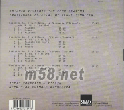 著名小提家 Terje Tonnesen與 norwergian chamber orchestra重新編曲及演繹韋華弟的四季,配合四季的不同景致加插了特別的效果,與季麗的弦樂(lè)交織出這首家喻戶(hù)曉的名曲,四季鮮明全新感受.