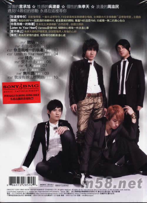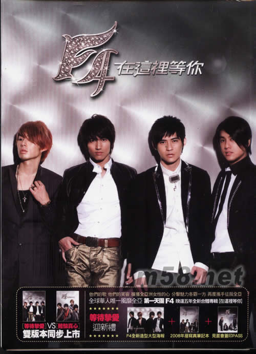 在這里等你(等待摯愛版)(m58.net) 2007全亞樂迷對F4的渴望再度沸騰。 在全亞洲歌迷的殷切期盼下 F4再次相聚 這是一場聚之不易的同學(xué)會 宛如戀愛紀念日 歌迷恭候期盼 找回當初相遇時的甜蜜味道 但就像相戀多年的戀人 在特別的日子與時刻 我們都期待著尋回當初相遇的感動 回到 當初我們認識的4個大男孩 天真 可愛 的赤子之心… 在這裡 F4始終為你保留著 相遇時那份單純 在這裡 他們永遠不變 F4全新專輯 「在這裡等你」 期待這一次的相聚 再次給你戀愛的感動 再次全亞同步點燃「F4熱潮」全面發(fā)燒。 搶鮮推薦 ◎【在這裡等你】回首發(fā)現(xiàn)愛 一直在這裡等你 F4全新風格氣勢磅礡合唱曲 臺灣觀光代言偶像劇「這裡發(fā)現(xiàn)愛」主題曲 ◎【體驗】每段你與F4一起度過的快樂時光 都是最美的體驗 專屬F4的溫柔R&B 珍藏獨一無二的真心告白 ◎【你是我唯一的執(zhí)著】言承旭主演連續(xù)劇「白色巨塔」話題主題曲 首度實體收錄 ◎【Listen to Your Heart】Vanness吳建豪柔情R&B 傾聽妳心裡每一件浪漫心事 ◎【愛不停止】朱孝天個性抒情搖滾 訴說堅強男人背后的心碎 ◎【殘念】仔仔周渝民深情的遺憾 成熟唱功感動直達心底