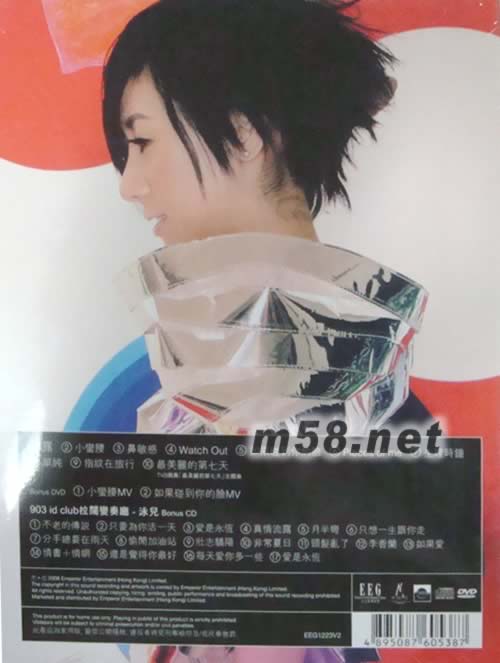 CD 01. 露 02. 小蠻腰 03. 鼻敏感 04. Watch Out 05. 如果碰到你的臉 06. Pieces Of Me 07. 生理時(shí)鐘 08. 單純 09. 指紋在旅行 10. 最美麗的第七天 DVD 01. 小蠻腰 MV 02. 如果碰到你的臉 MV 泳兒拉闊變奏廳Bonus CD 01. 不老的傳說 02. 只要為你活一天 03. 愛是永恒 04. 真情流露 05. 月半彎 06. 只想一生跟你走 07. 分手總要在雨天 08. 偷閒加油站 09. 非常夏日 10. 頭發(fā)亂了 11. 李香蘭 12. 如果愛 13. 情書 + 情網(wǎng) 14. 還是覺得你最好 15. 每天愛你多一些 16. 壯志驕陽(yáng) 17. 愛是永恒
