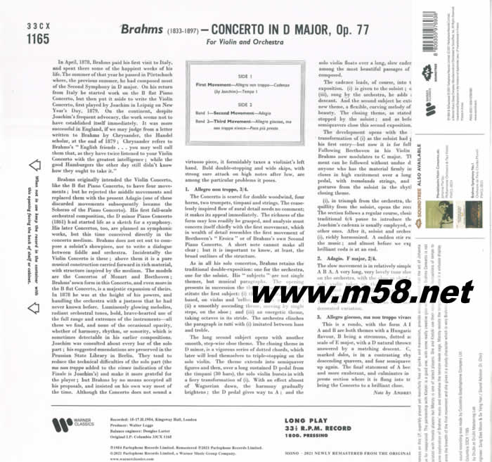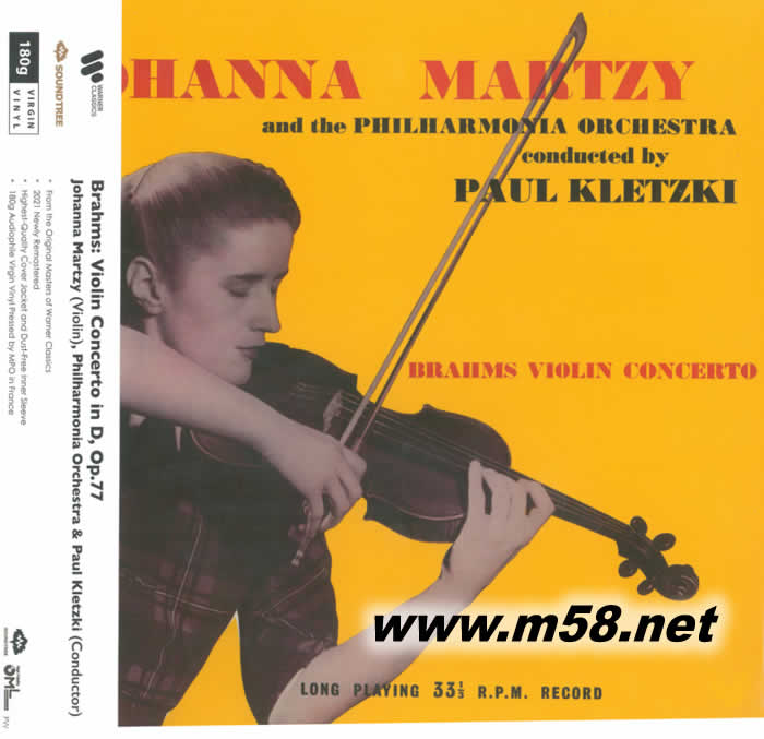 夢幻琴音 馬茨 勃拉姆斯 莫扎特 BRAHMS & MOZART 小提琴 黑膠(m58.net) Brahms & Mozart (夢幻琴音) 大名鼎鼎,更是部分資深樂迷稱為大師之大師,原籍波蘭之克萊茨基 (Paul Kletzki)指揮Philharmonia Orchestra。再加上音樂藝術生涯長達半個世紀之德國籍約夫姆(Eugen Juchum)指揮Bavarian Radio Symphony Orchestra)巴伐利亞廣播交響樂團,天賦藝術小提琴家瑪茨(Johanna Martzy)之精湛演出,琴音顫動誘人,音調精確無誤,布拉姆斯(Brahms)小提琴協奏曲當中管弦樂隊突然爆發,夢幻的段落演變,小提琴獨奏部分以突擊角度進入,一波蕩盪和火熱的演奏后,以一個愉快的獨奏小提琴完成。樂曲對獨奏者強大的技術要求,大量使用多個短暫停止及斷弦,快速的段落和節奏之變化,瑪茨(Johanna Martzy)近乎完美地一一完成。
