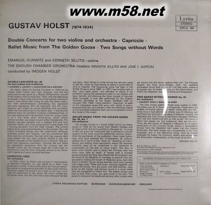 霍爾斯特 雙協(xié)奏曲雙小提琴協(xié)奏曲(首版)HOLST 140g 33RPM LP 黑膠(m58.net) 140g 33RPM LP Lyrita創(chuàng)立於 1958 年, 是一家依靠老板 Richard Itter 個人理想和興趣維持的小公司。 Lyrita小歸小,卻堪稱唱片業(yè)的奇蹟。 因為清一色英國作曲家的 "超冷門" 曲目, 居然沒有在歷史洪流中 "倒店",或被其他大公司併吞, 直到現(xiàn)在,還是一家獨立、健在的小公司。 其主因就是 70 年代后,靠著 TAS 的發(fā)燒榜單, 在音響圈,在發(fā)燒迷中,掙得一席之地。 Lyrita老板堅持 LP 的聲音比 CD 好多了, 所以一直不愿將該公司的錄音轉成 CD。 直到黑膠確定走入歷史的 1990 年,才開始發(fā)行了少部份的 CD。