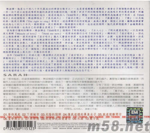 陳淑樺,她是七十到八十年代最成功的華語女歌手之一,也是曾感動數百萬聽眾,都會女子與情歌的最佳代言人,而一向不是以造型或嘩眾取寵的表演受到歡迎的她,經歷了許多不同的歌唱階段才成為唱片界的票房保證,而讓陳淑樺的聲勢達到登峰造極的地位,就是從她加入[EMI唱片]開始,所推出的專輯所為她奠定下來的。在[EMI唱片]的這個階段,陳淑樺推出了[星光滿天]、[海洋之歌]、[浪跡天涯]、[無盡的愛]、[情],以及她的第一張英文專輯[The right to sing]等唱片。這些專輯中的所有歌曲,曲風之豐富 、類型之多樣,讓陳淑樺著實的成為七十到八十年代,橫跨國語、英文專輯第一暢銷量的女歌手。也在這段期間,她代表華視獲得了金鐘獎最佳女歌手的殊榮,也為自己的演藝生涯建立了一個新的里程碑。