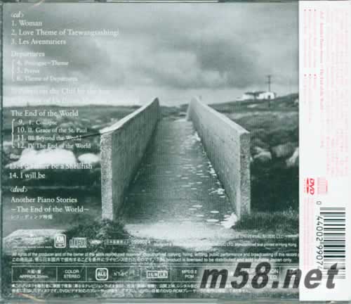 CD 01.Woman 02.Love Theme of Taewangsashingi 03.Les Aventuriers Departures 04.Prologue~Theme 05.Prayer 06.Theme of Departures 07.Ponyo on the Cliff by the Sea 08.Destiny of Us (from Musical Turandot) The End of the World 09.Ⅰ. Collapse 10.Ⅱ. Grace of the St.Paul 11.Ⅲ. Beyond the World 12.Ⅳ. The End of the World Bonus Track 13.I'd rather be a Shellfish 14.I will be DVD Another Piano Stories ~The End of the World~ レコーディング映像