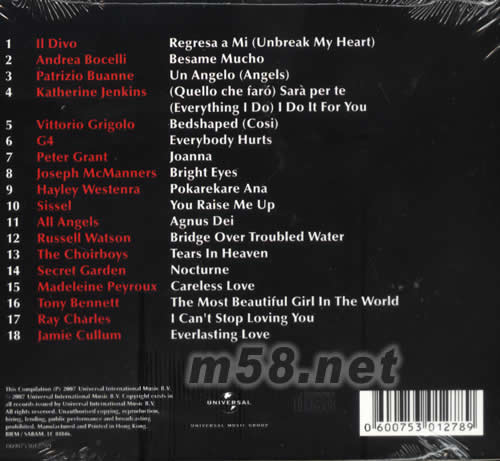01. II Divo -Regresa a Mi(Unbreak My Heart) 02. Andrea Bocelli -Besame Mucho 03. Patrizio Buanne -Un Angelo(Angels) 04. Katherine Jenkins -(Quello che faro)Sara Per te(Everything I Do)I Do It For You 05. Vittorio Grigolo -Bedshaped(Cosi) 06. G4 -Everybody Hurts 07. Peter Grant -Joanna 08. Joseph McManners -Bright Eyes 09. Hayley Westenra -Pokarekare Ana 10. Sissel -You Raise Me Up 11. All Angels -Agnus Dei 12. Russell Watson Bridge Over Troubled Water 13. The Choirboys Tears In Heaven 14. Secret Garden -Nocturne 15. Madeleine Peyroux -Careless Love 16. Tony Bennett -The Most Beautiful Girl In The World 17. Ray Charles -I Can't Stop Loving You 18. Jamie Cullum Everlasting Love