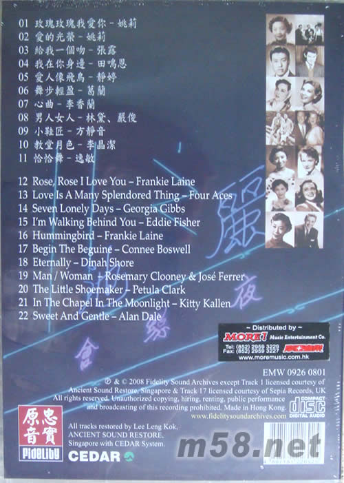 01. 玫瑰玫瑰我愛你 - 姚莉 02. 愛的光榮 - 姚莉 03. 給我一個吻 - 張露 04. 我在你身邊 - 田鳴恩 05. 愛人像飛鳥 - 靜婷 06. 舞步輕盈 - 葛蘭 07. 心曲 - 李香蘭 08. 男人女人 - 林黛、嚴俊 09. 小鞋匠 - 方靜音 10. 教堂月色 - 李晶潔 11. 恰恰舞 - 逸敏 12. Rose, Rose I Love You - Frankie Laine 13. Love Is A Many Splendored Thing - Four Aces 14. Seven Lonely Days - Georgia Gibbs 15. I’m Walking Behind You - Edde Fisher 16. Hummingbird - Frankie Laine 17. Begin The Beguine - Connee Boswell 18. Eternally - Dinah Shore 19. Man / Woman - Rosemary Clooney & Jose Ferrer 20. The Little Shoemaker - Petula Clark 21. In The Chapel In The Moonlight - Kitty Kallen 22. Sweet And Gentle - Alan Dale a