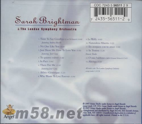 TIME TO SAY GOODBYE 美版(m58.net) 1997年全球流行樂壇最熱門的話題之一,莫過于由英國音樂劇第一女伶莎拉?布萊曼與意大利盲歌手波伽利所合唱的《告別時刻》(Time To Say Goodbye)一曲。以雷霆萬鈞之勢,橫掃古典流行跨界音樂領域。單單在德國,這首單曲便銷售了300萬張,成為德國有史以來最暢銷的單曲唱片。除此之外,更高居英國流行榜亞軍以及法、瑞、奧、意等國的極度高名次。 這首曲子是德國拳王亨利?馬斯克為他傳奇生涯的告別賽而特別邀請他最鐘愛的女歌手莎拉?布萊曼所作的演唱;莎拉接受這個光榮的委托之后,再由她挑選了這首意大利歌曲,并指定與原唱者波伽利合唱。然而,在這場1996年11月舉行的拳賽中,亨利竟意外地落敗,當他登臺謝幕,《告別的時刻》動人的旋律同時響起,聞者莫不動容;于是,一個傳奇告別的同時,另一個音樂的傳奇卻正式登場。 莎拉?布萊曼生于倫敦,18歲時在Hot Gossip劇團以《I lost My Heart To The Starship Troopers》迎來了自己的首次成功。在發行了第二支金曲后,莎拉參加了Andrew Lloyd Webber爵士的CATS的演出。與Placido Domingo合作Webber的歌劇《Reqiuem》。不久,參與音樂劇《Phantom Of The Opera》中的Christine這一角色在倫敦和紐約上演。 在莎拉?布萊曼(Sarah Brightman)的每張專輯中,她無與倫比的兼具古典與流行的音樂都能得到驚人的闡釋。她是當代最有傳奇色彩的舞臺劇名伶,由她所詮釋的韋伯的代表作《歌劇魅影》、《安魂曲》等早已成為音樂劇史上的里程碑,創造了一個又一個神話。她與卡雷拉斯合唱的巴塞羅納奧運會的主題歌《Friend For Life》,與Andrea Bocelli合唱的《To Say Goodbye》,都已成為音樂史上的經典。在她的演唱中,完美地融合了古典與流行的元素,使她的音樂具有無窮的魅力。