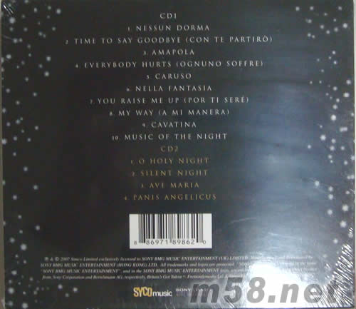 01. Nessun Dorma 02. Time To Say Goodbye (Con Te Partiro) 03. Amapola 04. Everybody Hurts (Ognuno Soffre) 05. Caruso 06. Nella Fantasia 07. You Raise Me Up (Por Ti Sere) 08. My Way (Mi Manera) 09. Cavatina 10. Music Of The Night CD2 1 O HOLY NIGHT 2 SILENT NIGHT 3 AVE MARIA 4 PANIS ANGELICUS