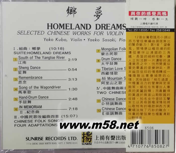 1. South of the Yangtse River/江南 2:19 2. Sheng Dance/笙舞 0:54 3. Remembrance/思念 3:13 4. Song of the Wagondriver/馬車歌 1:30 5. Hand-Drum Dance/手鼓舞 2:48 6. In Memoriam/紀念曲 7:18 7. Mongolian Folk Song/蒙古民歌 4:05 8. Drum Dance/太平鼓舞 1:14 9. Tibetan Love Song/西藏情歌 4:28 10. Ali Mountain Song/阿里山之歌 5:20 11. Chinese Dance in D/D羽調舞曲 2:14 12. Chinese Dance in E/E徵調舞曲 5:04