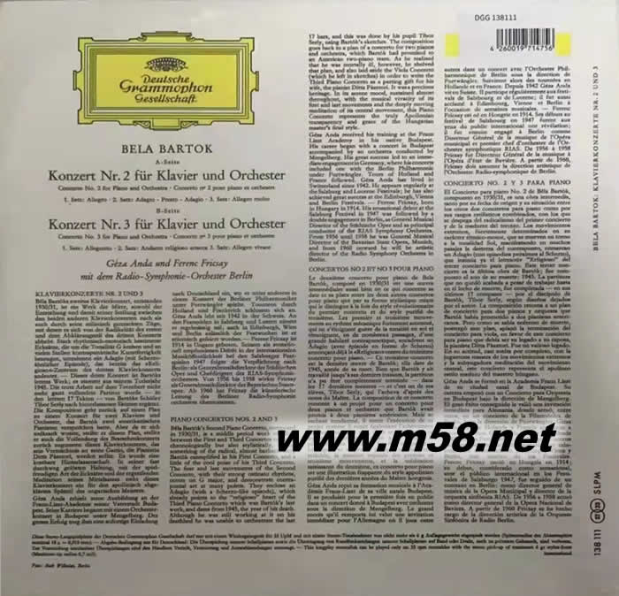 巴托克希望他的第二鋼琴協奏曲能被理解為與他那刺耳的管弦樂隊來說極其困難的第一鋼琴協奏曲的對比。盡管主題更容易理解,但這部作品也采用了嚴格的古典奏鳴曲形式。第一樂章的主題在明亮的氣氛中,在號角聲的激勵下向前邁進,為整個作品設定了方向。在獨奏者和管弦樂隊之間活躍的活力和堅定的相互作用下,這部作品自始至終都是積極的,充滿活力,但一直到最后一樂章都像鐘聲一樣,易于接近。巴托克于1945年去世,創作了他的第三首也是最后一首鋼琴協奏曲。然而,這部作品并沒有一種死亡的情緒,而是散發著一種世故、歡快、醇厚的氛圍。悅耳動聽的旋律,在中層樂章中有一種悅耳的旋律,被編織成一種節奏活躍、圓潤流暢的樂章結構。憑借這兩首鋼琴協奏曲,Géza Anda和由傳奇人物費倫茨·弗里塞(Ferenc Fricsay)領導的RSO Berlin完成了他們偉大的藝術成就,這始于錄制巴托克的狂想曲作品1和他的第一首鋼琴協奏曲(DGG 138 708)。對于任何只擁有這兩個LPs中的一個的人來說,另一個是絕對必要的。