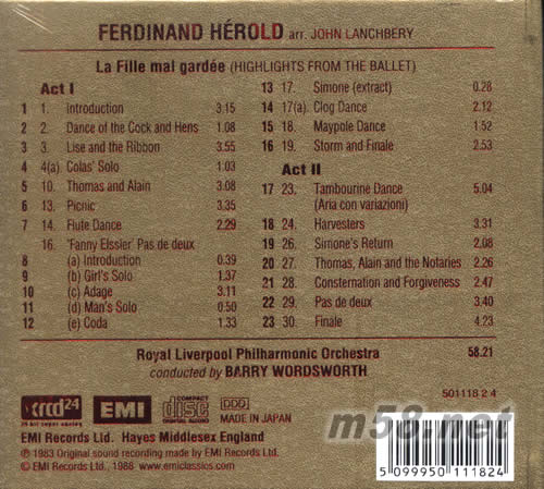 Herold-Lanchbery La fille mal gardee (奶媽/園丁的女兒) XRCD(ABS錄音室XRCD系列)(m58.net) 聞名天下的《奶媽》靚聲到極,稱之為最值得買的CD,大概沒有人抗議吧!奶媽碟受歡迎,并非只因為錄音夠靚,其實還因為它非常[好聽],場面有時輕松,有時熱鬧,有時高潮迭起,旋律動聽而不重復,聽上百遍仍不會厭倦,說不定有很多Hi-Fi友就因為聽過此碟而愛上古典音樂。 《音響世界》十周年特刊推崇為知名度最高的10張示范唱片之一 經典的音樂、精心的演繹、驚人的錄音 ——欣賞法國芭蕾舞劇《園丁的女兒》音樂唱片 法國浪漫派作曲家埃羅爾德 (Herold),對大家來說也許十分陌生,然而他創作的芭蕾舞劇《園丁的女兒》(La Fille Mal Gardee)音樂,卻是非常著名、讓人喜愛的,特別是在音響界影響頗廣,幾乎無人不知。埃羅爾德先生出生于1791年,就學于巴黎音樂學院,1812年獲“羅馬獎”,1819年第一部歌劇演出于那不勒斯, 1816年起在巴黎創作歌劇和芭蕾舞劇音樂以終其年。