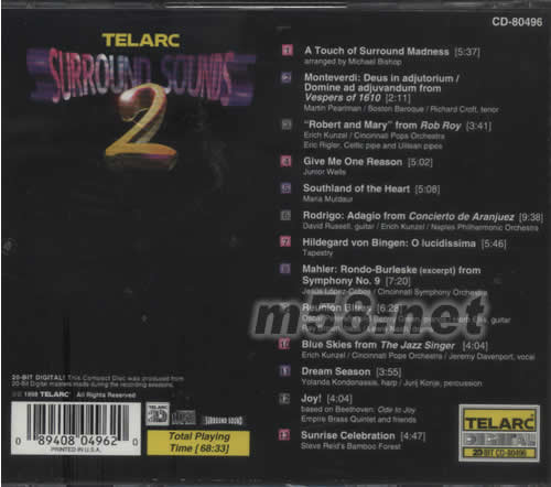 1.A Touch of Surround Madness [5:37] 2.Monteverdi:Deus in adjutorium/ Domine ad adjuvandum from Vespers of 1610 [2:11] 3."Robert and Mary"from Rob Roy [3:41] 4.Give Me One Reason [5:02] 5.Southland of the Heart [5:08] 6.Rodrigo:Adagio from Concierto de Aranjuez [9:38] 7.Hildegrad von Bingen:O lucidissima [5:46] 8.Mahler:Rondo-Burleske(excerpt)from Symphony No.9 [7:20] 9.Reunion Blues [6:28] 10.Blue Skies from The Jazz Singer [4:04] 11.Dream Season [3:55] 12.Joy! [4:04] 13.Sunrise Celebration [4:47]