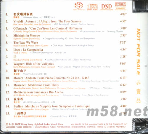 香港高級視聽展2007原音精選SACD(m58.net) 附送大會精心選輯靚聲雙層SACD《2007原音精選》一只,SACD或CD機皆可播放,內里精選來自不同國家、廣為音響發燒友鐘愛的美妙音樂,目的旨在讓普羅大眾有機會接觸不同音樂文化及享受迫真的錄音效果