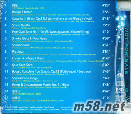 01. 約定-王菲 02. Bolero/Torero 卡門組曲 03. Concerto in LA min Op.3N.9 per violino e archi:Allegro/Vivaldi 小提琴協奏 04. Stand By Me 菲籍女歌手-米納 05. Peer Gynt Suite No.1 Op.23:Morning Mood/Edward Grieg 賈維指揮瑞典哥德堡交響樂團 06. Smoke Gets in Your Eyes 日本爵士鋼琴大師山本剛 07. Shenandoah 羅玧宣 08. Pie Jesu 女高音Nancy Keith 09. Carmen Fantasy/Bizet 敲擊卡門幻想曲 10. Que Sera Sera 隨遇而安-珍妮德賽 11. Adagio Cantabile from Sonata Op.13(pathetique)/Beethoven 鋼琴悲慘奏鳴曲 12. Stjernelause Dogn--Kari BreMnes 現場LIVE 13. Pomp & Circumstance March No.1/Elgar 威風凜凜進行曲第一號 14. 落水天-黃紅英-客家 15. 將軍令-20臺古箏演奏