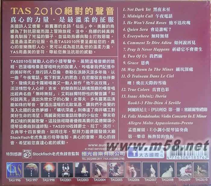 TAS 絕對(duì)的聲音CD 2010 鬼斧神功(m58.net) TAS 2010 絕對(duì)的聲音 挑戰(zhàn)最挑剔的耳朵 真心的力量‧是最溫柔的征腹 收錄古典、拉丁、爵士、流行等十四首樂(lè)曲 德國(guó)老虎魚(yú) 原版母帶製作 英國(guó)詩(shī)人艾德蒙?斯賓塞的史詩(shī)《仙后》中,美麗的烏娜為了對(duì)抗惡龍而踏上冒險(xiǎn)旅程;途中,烏娜的純真與善良馴服了兇猛的獅子,并協(xié)助烏娜與騎士打敗惡龍。這是最溫柔的征服,也是《絕對(duì)的聲音2010》所要呈獻(xiàn)給您的,真心的音樂(lè)撫慰人心,更可以成為抵抗亂世的溫柔力量,用最美的音符,帶給您無(wú)法抗拒的感動(dòng)。《絕對(duì)的聲音2010》在撼動(dòng)人心的小提琴聲中,展開(kāi)這場(chǎng)音樂(lè)的旅程,芭菠楊格像是穿梭時(shí)光的說(shuō)書(shū)人,吟唱著我們記憶中的美好年代;旅行詩(shī)人亞倫?泰勒在浪跡天涯多年后,以一曲“午夜電話”寫下對(duì)家人的思念;在尼龍弦吉他伴奏下,發(fā)燒天后卡羅爾·基德唱著又一動(dòng)人新作“他不送玫瑰”,淡淡情愁令人心碎;吉米?約杰森則以銷魂頹廢的嗓音唱出經(jīng)典名曲“無(wú)時(shí)無(wú)刻”;艾莉絲獨(dú)特野性的聲音讓“如何說(shuō)再見(jiàn)”道出失戀女子的心聲;史蒂夫?多布羅葛茲清脆如珠的琴音,穿透出溫暖的北歐氣息,讓我們不自覺(jué)的落入北國(guó)的金色夢(mèng)鄉(xiāng);“礦坑深處”則傳達(dá)了南非礦工對(duì)美好生命的渴望;瑪麗姿宛如童話故事的小仙女,帶來(lái)奇異幻境的美麗歌聲。這段旅程隨著優(yōu)雅高貴的門德?tīng)査尚√崆賲f(xié)奏曲到達(dá)終點(diǎn)。 《絕對(duì)的聲音2010》收錄爵士、拉丁、流行、古典等十四首樂(lè)曲,如同往年,堅(jiān)持力邀德國(guó)發(fā)燒大廠老虎魚(yú)進(jìn)行母帶后製。真心的音樂(lè),用心的錄音,希望給您直達(dá)心底的感動(dòng)。