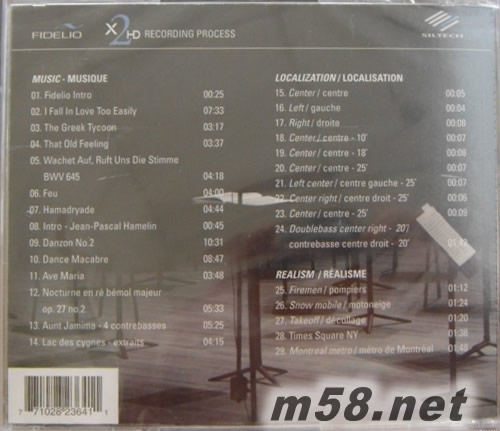 發燒膽咪生產商「Fidelio Audio」使用德國Siltech線材錄音專集,全碟分為三部分,第一部分約一小時作品,是搜集了Fidelio Audio十四首出眾錄音,當中包括人聲、爵士、古典及即興作品。首首精彩,保證聽者如癡如醉,就像 CD封面一樣。精簡CD內頁圖案獨立顯示每首歌曲之人聲及各種樂器的擺放位置,聽者只要加入揚聲器及皇帝位之配合,即可按圖索驥了解自己之音響器材的分析能力是否『夠班』,清楚分析出歌曲內各組樂器的位置后,可繼續第二及第三部分之定位(Localization)及空間真實感(Realism)之播放,根據CD內頁表示,多段不同距離拍掌聲錄音,定位在收音咪之10呎前、10、18及25呎,十分精確。第三部分是五段現場環境收音,在火警現場、雪車行駛、飛機出發、紐約時代廣場及蒙特利爾地下鐵路現場環境,收音師以入耳式耳機鑑聽拾音,他建議使用耳機和揚聲器作前后比較,那種空間之實在感,可嚇你一跳。