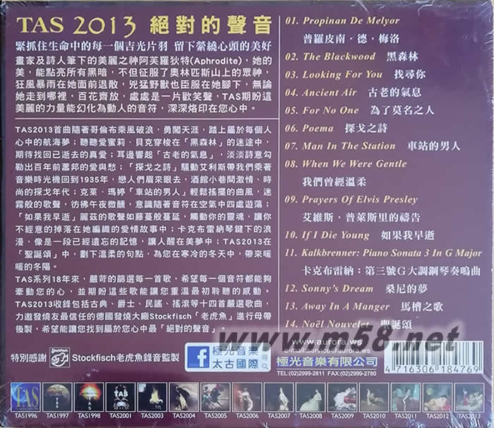 畫家及詩人筆下的美麗之神阿芙羅狄特(Aphrodite),她的美,能點亮所有黑暗,不但征服了奧林匹斯山上的眾神,狂風暴雨在她面前退散,兇猛野獸也臣服在她腳下,無論她走到哪里,百花齊放,處處是一片歡笑聲,TAS期盼這美麗的力量能幻化為動人的音符,深深烙印在您心中。 TAS2013首曲隨著哥倫布乘風破浪,勇闖天涯,踏上屬於每個人心中的航海夢;聽聽愛蜜莉.貝克穿梭在「黑森林」的迷途中,期待找回已逝去的真愛;耳邊響起「古老的氣息」,淡淡詩意勾勒出百年前蕭邦的愛與愁;「探戈之詩」騷動艾利斯帶我們乘著音樂時光機回到1935年,戀人們眉來眼去,酒館小巷間激情、時尚的探戈年代;克萊.瑪婷「車站的男人」輕鬆搖擺的曲風,迷霧般的歌聲,彷彿午夜微醺,意識隨著音符在空氣中四處游蕩;「如果我早逝」麗茲的歌聲如藤蔓般蔓延,觸動你的靈魂,讓你不經意的掉落在她編織的愛情故事中;卡克布雷納琴鍵下的浪漫,像是一段已經遺忘的記憶,讓人醒在美夢中;TAS2013在「圣誕頌」中,劃下溫柔的句點,為您在寒冷的冬天中,帶來暖暖的冬陽。 TAS系列18年來,嚴苛的篩選每一首歌,希望每一個音符都能夠牽動您的心,並期盼這些歌能讓您重溫最初聆聽的感動。TAS2013收錄包括古典、爵士、民謠、搖滾等十四首嚴選歌曲,力邀發燒友最信任的德國發燒大廠Stockfisch「老虎魚」進行母帶后製,希望能讓您找到屬於您心中最「絕對的聲音」。