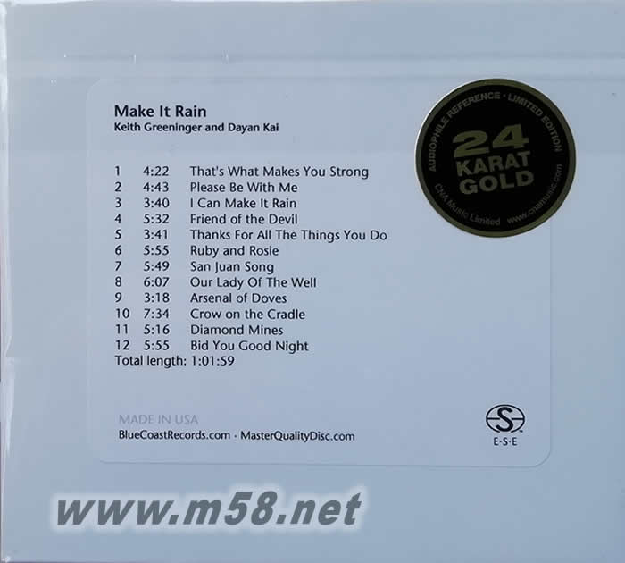 KEITH GREENINGER & DAYAN KAI MAKE IT RAIN MQDCD限量版(風(fēng)雨的考驗(yàn)) 藍(lán)岸精選系列(m58.net) Make It Rain MQD Limited Edition (風(fēng)雨的考驗(yàn)) 母盤直錄,藍(lán)岸唱片王牌結(jié)他男歌手Keith Greeninger聯(lián)同創(chuàng)作歌手Dayan Kai首次合作,慢條斯理的節(jié)奏,顯示出結(jié)他手之功力,兩把聲音,合拍唱和,兩支結(jié)他時(shí)而對和,一聽就是藍(lán)岸唱片風(fēng)味,靚錄音加靚歌。