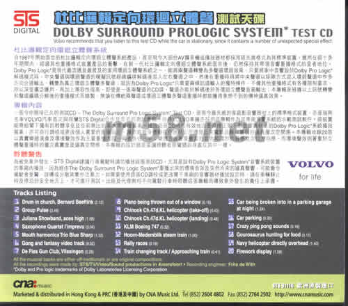 價格為估,以實到貨為準! 杜比邏輯定向環回立體聲(m58.net) 杜比羅輯定向環回立體聲測試天碟 逼真動人。立體傳神。試機必備 家中及車廂影音器材的最佳拍檔 杜比邏輯定向環回立體聲 杜比邏輯定向環回立體聲系統 自1987年開始面世的杜比邏輯定向環回立體聲系統產品,直至現今大部份AV擴音機或播放器材都采用這先進格式為其標準裝置,雖然在這十多年期間內,經過其他重播格式裝置產品的沖擊,在新一代杜比邏輯定向環回立體聲系統面世后,仍然保持其帶領音響重播格式的皇者地位。Dolby Pro Logic*是現代最流通及最普及的家用環回立體聲系統之一,能將兩聲道轉變為多聲道環回效果,只要將家中音響設于Dolby Pro Logic*解碼模式時,中央聲道與環回聲道的摸擬訊號經過編排解碼后混入左右聲道之中,然后在重播時再將中央聲道以矩陣方式混入環回聲道中作多方向分道輸出,轉變為真正環回立體聲多聲道;就因為Dolby Pro Logic*只需要兩條訊道輸入的獨特條件,不像其他重播格式有各種限制要求,所以深受廣泛運用,再加上兼容性很高,即使是一張兩聲道的CD碟,聲道亦能于解碼后于各環回立體聲音箱輸出;本專輯是根據以上訊號轉變和聲道編碼分解后的重播模式而錄制,無論在傳統兩聲道或環回立體聲多聲道重播時都能獲得意想不到的傳神逼真效果。 專輯內容 一張令你期待已久的測試CD-The Dolby Surround Pro Logic System* Test CD,是現今最先進的家庭影音響器材上標準程式裝置,亦是瑞典名車VOLVO汽車首次與荷蘭STS Digital合作及命名的測試專輯,瑞典VOLVO車廠亦采用這專輯作為其車廂音響系統的示范測試軟件。這裝置能帶給閣下獨有的聆聽享受及空前無比的高水準重播質素。播放這張CD時能有效地改善及修正閣下影音響器材上的Dolby Pro Logic*系統播放質素;亦可自行調校或更改個人喜愛的重播設定,讓你能親身體驗在你器材上所爆發出來驚駭及難以置信的逼真層次空間感。本專輯收錄20首以真實樂器演奏及環境聲效作為主要重播內容,兩者各占一半;樂器方面著重豐富的音色和濃烈的質感及定位方向感,而環境聲效則著重于立體聲重播時的層次真實度及逼真空間感,本專輯的設計就是要讓聆聽者感覺猶如身處在其中一樣。 聆聽警告 為被免意外發生,STS Digital建議行車駕駛請勿播放這張測試CD,尤其是設有Dolby Pro Logic System*音響系統裝置的車廂內播放,因為經由The Dolby Surround Pro Logic System*重播出來的環境音效及突然而來的逼真聲響,可能會令駕駛者受驚、誤導或分散其集中注意力。如需要使用這張CD調校或更改閣下車廂的音響器材播放設定時,請在車輛靜止時及停泊于安全地方上,才可進行測試。出版及代理商均不向駕駛行車時聆聽這張專輯而導致意外發生的責任上承擔。