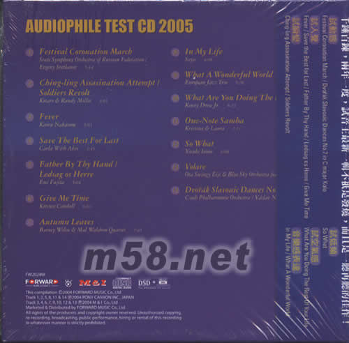 價(jià)格為估,以實(shí)到貨為準(zhǔn)! 試音王2005(m58.net) 請(qǐng)點(diǎn)看產(chǎn)品正、背面大圖 載譽(yù)歸來,非同凡響 千錘百煉,兩年一度,試音王最新一輯不只是發(fā)燒,而且是一聽再聽的佳作! 試動(dòng)太 FESTIVAL CORONATION MARCH/VDVORAK SLAVOUIC DANCES NO。7 IN C MAJOR KOLO 試人聲: FEVER /SAVE THE BEST FOR LAST /FATHER BY THY HAND/LEDSAG OS HERRE/GIVE ME TIME 試瞬變 CHING -LING ASSASINATION ATTEMPT/SOLDIERS REVOLT 試低頻 SO WHAT 試空氣感 WHST ARE YOU DOING THE BEST OF YOUR LIFE 音樂感表達(dá) IN MY LIFE/WHAT A WONDERFUL WORLD