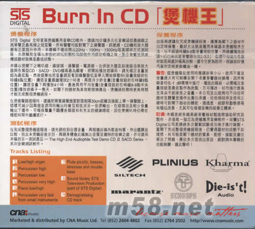 STS Digital全球首張煲機(jī)專用音樂(lè)CD軟件,透過(guò)70分鐘多元化音樂(lè)涵拓最細(xì)致之風(fēng)琴聲及最高頻之短笛聲,所有聲響均能對(duì)閣下之揚(yáng)聲器、訊號(hào)線、CD機(jī)和放大器都有正面提升作用。本專輯不像坊間以22HZ 150HZ高頻率方式測(cè)試碟,本專輯則全碟以樂(lè)器的高低頻動(dòng)能和平衡作用達(dá)至暖機(jī)之效,能令音響及訊號(hào)傳送器材發(fā)揮于最佳狀態(tài)。