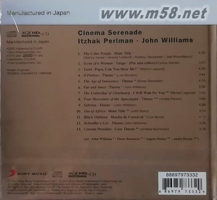 CINEMA SERENADE ITZHAK PERLMAN帕爾曼電影琴聲 K2HD專輯背面圖片
