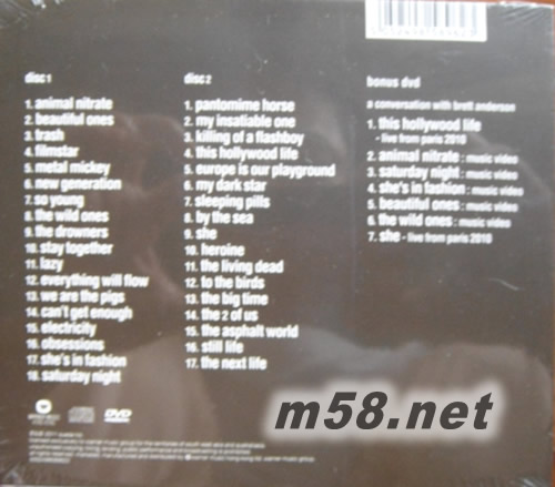 DISK 1 CD 1. Animal Nitrate 2. Beautiful Ones 3. Trash 4. Filmstar 5. Metal Mickey 6. New Generation 7. The Drowners 8. Stay Together 9. Lazy 10. Everything Will Flow 11. We Are the Pigs 12. Can`t Get Enough 13. Electricity 14. Obsessions 15. She`s in Fashion 16. Saturday Night DISK 2 CD 1. Pantomime Horse 2. My Insatiable One 3. Killing of a Flashboy 4. This Hollywood Life 5. Europe Is Our Playground 6. My Dark Star 7. Sleeping Pills 8. By the Sea 9. She 10. Heroine 11. The Living Dead 12. To the Birds 13. The Big Time 14. The Two of Us 15. The Asphalt World 16. Still Life 17. Next Life DISK 3 DVD 1. This Hollywood Life (Live from Paris 2010) 2. Animal Nitrate (Music Video) 3. Saturday Night (Music Video) 4. She`s in Fashion (Music Video) 5. Beautiful Ones (Music Video) 6. The Wild Ones (Music Video) 7. She (Live from Paris 2010)