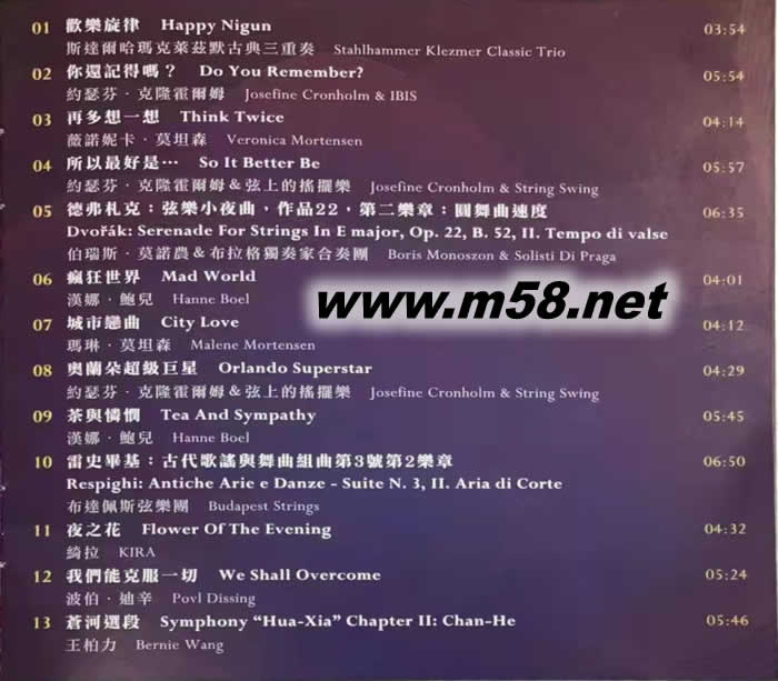 一第41屆臺北國際音響暨藝術大展紀念CD之母帶製作由德國老虎魚錄音室旗下母帶工作室 PaulerAcoustics操刀音質自然是無庸置疑的好,收錄曲目眾多,囊括室內繼、爵士繕,以及美聲歌喉的曲目類型,非常適合愛樂者細細品味其中蘊含的音樂之美·曲目包括「Happy NigunDo YouRemmbeThink TwiceDvorakSerenade for Strings inE majorOp.22B.52,IITempo di valseMad World City Love rOrlando SuperstarTea And SympathyOttorino Respighi:Antiche Arie e DanzeFlower Of The EveningWeShall Overcome以及Huaxia-Sky andRiver等共13首曲目