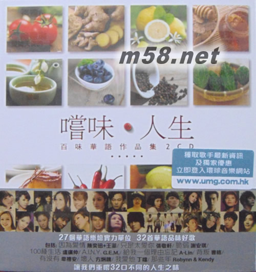 嘗味 人生 - 百味華語作品集(m58.net) 繽紛如調味架的歌曲 帶你重嘗當天的酸甜苦辣 嘗味‧人生 - 百味華語作品集 2CD 27個華語樂壇實力單位 32首華語品味好歌 包括: 因為愛情 陳奕迅+王菲/ 只是太愛你 張敬軒/ 脆弱 謝安琪/ 100種生活 盧廣仲/ A.I.N.Y. G.E.M./ 給我一個理由忘記 A-Lin/ 背叛 曹格/ 有沒有 韋禮安/ 壞人 方炯鑌/ 我愛他 丁噹/ 那些年 Robynn & Kendy 讓我們重嘗32口不同的人生之味