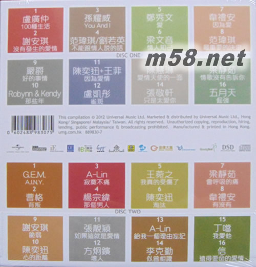 CD 1 01. 100種生活 - 盧廣仲 02. 沒有發生的愛情 - 謝安琪 03. You And I - 孫耀威 04. 不能跟情人說的話 - 范瑋琪/劉若英 05. 愛 - 鄭秀文 06. 情人知己 - 梁文音 07. 因為愛 - 韋禮安 08. 最重要的決定 - 范瑋琪 09. 好的事情 - 嚴爵 10. 那些年 - Robynn & Kendy 11. 因為愛情 - 陳奕迅+王菲 12. 雀斑 - 盧凱彤 13. 愛情天使的一面 - 陳慧琳 14. 只是太愛你 - 張敬軒 15. 情歌沒有告訴你 - 梁靜茹 16. 倔強 - 五月天 CD 2 01. A.I.N.Y. - G.E.M. 02. 背叛 - 曹格 03. 寂寞不痛 - A-Lin 04. 那個男人 - 楊宗緯 05. 我真的受傷了 - 王菀之 06. 淘汰 - 陳奕迅 07. 會呼吸的痛 - 梁靜茹 08. 有沒有 - 韋禮安 09. 脆弱 - 謝安琪 10. 心的距離 - 陳奕迅 11. 如果這就是愛情 - 張靚穎 12. 壞人 - 方炯鑌 13. 給我一個理由忘記 - A-Lin 14. 似曾相識 - 李克勤