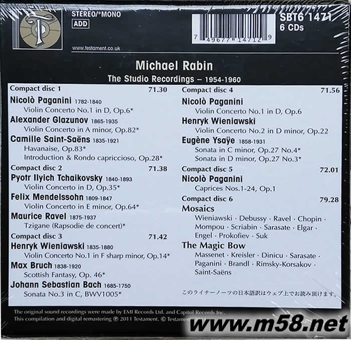 拉賓小提琴藝術 THE STUDIO RECORDINGS 1954-1960(6CD套裝)(m58.net) 絕版多年珍品,EMI原廠音源精心轉製, 非同凡響 精彩收錄 : 協奏曲( 帕格尼尼/ 柴可夫斯基/ 孟德爾頌/ 拉威爾/ 葛拉祖諾夫/ 韋尼奧夫斯基…)及由鋼琴/樂團伴奏之經典小品( 流浪者之歌 / 三個橘子之戀..)