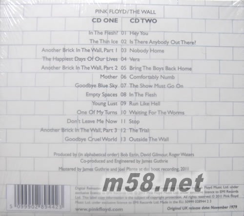墻THE WALL(2011全新錄制)(m58.net) ◎ 平克佛洛伊德之探索入門系列11 ◎ 2011年全新數位化母帶重製工程由《The Wall》專輯製作人與錄音名匠James Guthrie擔任 ◎ 內附流行藝術大師Storm Thorgerson全新設計28頁的CD內頁本 ◎ 勇奪葛萊美獎最佳錄音專輯大獎 ◎ 全球累積專輯銷售超過3000萬張 ◎ 全球10國排行冠軍曲〈Another Brick In The Wall Part 2〉與【神鬼無間】主題曲〈Comfortable Numb〉入選滾石雜誌史上最偉大500首歌曲名單 《The Wall》是全球樂評推崇音樂史上最偉大的概念專輯,平克佛洛伊德樂團核心人物Roger Waters以搖滾歌劇的風格,呈現面對「放棄」與「隔離」這兩大議題。專輯主題是在樂團1977年「In The Flesh巡迴演唱會」中萌芽,當時,Roger Waters感覺到來自於臺下觀眾的粗魯,那種感覺之強烈讓他幻想臺上表演的樂團與臺下的觀眾之間正在建構著一道墻。於是,他根據自己的成長經歷創造出Pink這個角色,Pink的父親在二次世界大戰中身亡,Pink從小在沒有父親的陪伴下成長,他從發生在他深愛的人與這個世界上的悲慘事件中、衍生出自我隔離狀態,長大后受到學校旅師的揶揄與虐待,這些精神創傷一直到他成為搖滾巨星的時候,都還糾纏著他,最后演變成精神分裂癥,導致婚姻與人生的破碎。Roger Waters用一道墻來比喻這種存在於社會與他自我隔離之間的障礙,《The Wall》專輯就是以Pink這個角色、破除成長過程中一道道存在於他個人與世界之間的墻,而衍出來的概念專輯。《The Wall》專輯在1979年11月發行,蟬連全美流行專輯榜15週冠軍,同時也在法國、德國、澳洲的排行榜奪冠,在英國流行專輯榜晉升至第三名,專輯至今的全球累積銷售超過3000萬張,其中在美國一地的2300萬張銷售,更讓此張專輯高居全美最暢銷的五張專輯之一。 Roger Waters在1990年德國柏林圍墻倒塌的歷史時刻,更號召歌手舉行「The Wall - Live In Berlin演唱會」。專輯中膾炙人口的驚世大作〈Another Brick In The Wall Part 2〉在英、美等全球10個國家的排行榜奪冠,這首暢銷曲與后來曾經用作奧斯卡最佳影片【神鬼無間】主題曲的〈Comfortable Numb〉,同時入選滾石雜誌史上最偉大500首歌曲名單。專輯本身也入選滾石雜誌史上最偉大500張專輯名單。日后以【烈血大風暴】一片獲得奧斯卡提名的導演亞倫派克在1982年將專輯內容賦予影像,改拍成由「Live Aid」援非義唱盛會的發起人Bob Geldorf領銜演出的電影【血灑暴力墻】。2011年重新發行版本由1980年以《The Wall》專輯勇奪葛萊美獎最佳錄音的錄音巨擘James Guthrie擔任全新數位化母帶重製技術製作,專輯內附流行藝術大師Storm Thorgerson全新設計長達28頁的CD內頁本。