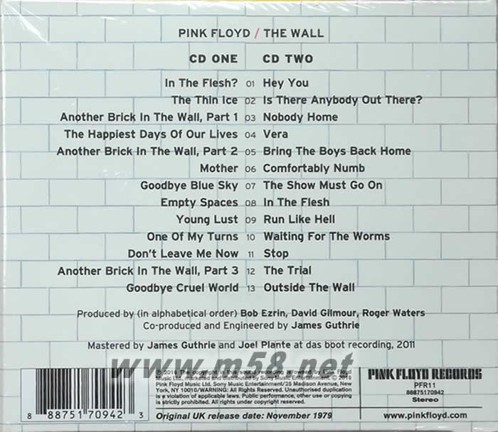 The Wall 墻(2016年版)(m58.net) 美國(guó)《搖滾名人殿堂》和英國(guó)《音樂(lè)名人堂》的至尊榮耀 搖滾傳奇平克佛洛伊德Pink Floyd,1979年第十一張錄音室專(zhuān)輯 ★史上最偉大的概念專(zhuān)輯,勇奪葛萊美獎(jiǎng)最佳錄音專(zhuān)輯大獎(jiǎng),全球累積專(zhuān)輯銷(xiāo)售超過(guò)3000萬(wàn)張!滾石雜誌史上最偉大500張專(zhuān)輯第87名 ★〈Another Brick In The Wall Part 2〉與〈Comfortable Numb〉入選滾石雜誌史上最偉大500首歌曲名單 「平克佛洛伊德Pink Floyd」整合迷幻和太空搖滾,將實(shí)驗(yàn)、敘事性豐富的前衛(wèi)搖滾,以及運(yùn)用哲學(xué)性的詞藻,摸索出前衛(wèi)搖滾的未來(lái),進(jìn)而造就了流行音樂(lè)史上最偉大的傳奇,每一個(gè)世代的樂(lè)迷不斷地從他們的音樂(lè)作品中,體驗(yàn)到跨越時(shí)空的聽(tīng)覺(jué)驚喜;每一個(gè)世代的樂(lè)團(tuán)持續(xù)在他們的音樂(lè)作品中,思考著搖滾樂(lè)所能創(chuàng)造的想像空間與情感共鳴。自1967年組隊(duì)以來(lái)至2014年底的最后一張專(zhuān)輯《The Endless River》,47年以來(lái),平克佛洛伊德歷年專(zhuān)輯的全球累積銷(xiāo)售量超過(guò)二億張,其中加總停留美國(guó)告示牌881週的傳世經(jīng)典《The Dark Side Of The Moon》、史上最偉大的概念專(zhuān)輯《The Wall》,都是影響后輩的膜拜圣碟。分別入籍美國(guó)《搖滾名人殿堂》和英國(guó)《音樂(lè)名人堂》的至尊榮耀、滾石雜誌和VH1頻道的《史上百組經(jīng)典藝人》、Q雜誌《史上最偉大的樂(lè)團(tuán)》名單,留給后世無(wú)數(shù)搖滾樂(lè)迷,一篇跨越半世紀(jì),定義完美經(jīng)典的搖滾史記。 The Wall》是全球樂(lè)評(píng)推崇音樂(lè)史上最偉大的概念專(zhuān)輯,平克佛洛伊德樂(lè)團(tuán)核心人物Roger Waters以搖滾歌劇的風(fēng)格,呈現(xiàn)面對(duì)「放棄」與「隔離」這兩大議題。《The Wall》專(zhuān)輯在1979年11月發(fā)行,蟬連全美流行專(zhuān)輯榜15週冠軍,同時(shí)也在法國(guó)、德國(guó)、澳洲的排行榜奪冠,在英國(guó)流行專(zhuān)輯榜晉升至第三名,專(zhuān)輯至今的全球累積銷(xiāo)售超過(guò)3000萬(wàn)張,其中在美國(guó)單一國(guó)家的2300萬(wàn)張銷(xiāo)售,更讓此張專(zhuān)輯高居全美最暢銷(xiāo)的五張專(zhuān)輯之一。Roger Waters在1990年德國(guó)柏林圍墻倒塌的歷史時(shí)刻,更號(hào)召歌手舉行「The Wall - Live In Berlin演唱會(huì)」。