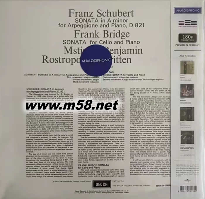 Side A Schubert : Sonata In A Minor For Arpeggione And Piano, D. 821 1. First Movement: Allegro Moderato 2. Second Movement: Adagio 3. Third Movement: Allegretto Side B Bridge : Sonata For Cello And Piano 1. First Movement: Allegro Ben Moderato 2. Second Movement: Adagio Ma Non Troppo ' Molto Allegro E Agitato 錄音資料: Recorded 22 - 27 July 1968 at the Maltings, Snape Producer : John Mordler Engineer: Gordon Parry & Kenneth Wilkinson