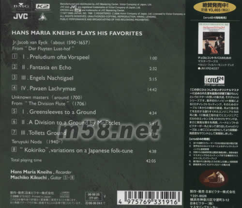 HANS MARIA KNEIHS PLAYS HIS FAVORITES JR.JACOB VAN EYCK (ABOUT 1590-1657) FORM "DER FLUYTEN LUST -HOF" 1.I.PRELUDIUM OFTE VORSPEEL 2.II.FANTASIA EN ECHO 3.III.ENGELS NACHTIGAEL 4.IV.PAVAEN LACHRYMAE UNKNOWN MASTERS (AROUND 1700) FROM"THE DIVISION FLUTE"(1706) 5.I.GREENSLEEVES TO A GROUND 6.II.A DIVISION TO A GROUND BY MR.ECCLES 7.III.TOLLETS GROUND TERUYUKI NODA(1940) 8.KOKIRIKO,VARIATIONS ON A JAPANESE FOLK -TUNE