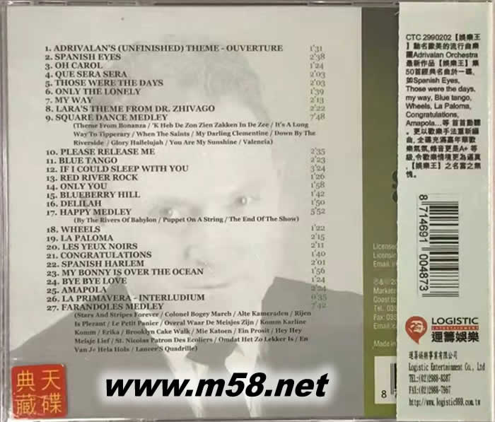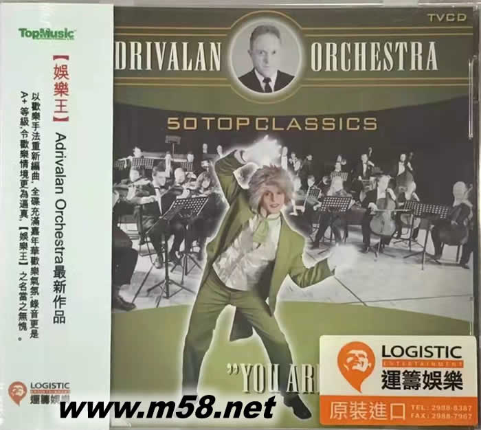 娛樂王 管弦樂團–50 首頂級經典 ADRIVALAN ORCHESTRA 50 TOP CLASSICS(m58.net) 不能錯過的超級"發燒"好碟:娛樂王 CD 管弦樂團–50 首頂級經典 ADRIVALAN ORCHESTRA 50 TOP CLASSICS(CTC2990202 ) 演奏:阿里沃蘭管弦樂團,首先它是由馳名歐洲各國的流行管弦樂團ADRIVALAN ORCHESTRA所演繹的最新作品,精選了50首不朽經典名曲,如〈西班牙的眼睛〉、〈噢,卡羅〉、〈藍色探戈〉……等,首首動聽。《娛樂王50 TOP CLASSICS》是一張充滿歡樂嘉年華氣氛的音樂專輯,龐大的銅管聲部和樂隊的配合天衣無縫,在熱情的指揮帶動下,時時帶出精彩的火花!錄音場面大氣,樂曲更是首首精彩,可以說是名曲大匯聚!一貫專業、嚴謹的TOP MUSIC的出品,聲音當然有十足的保證!音頻清晰、扎實厚重,充滿強勁的動力感,是大家千萬不能錯過的超級"發燒"好碟! 【娛樂王】馳名歐美的流行曲樂團Adrivalan Orchestra最新作品【娛樂王】集50首經典名曲於一碟,如Spanish Eyes, Those were the days, my way, Blue tango, Wheels,La Paloma, Congratulations, Amapola..等首首動更以歡樂手法重新編曲,全碟充滿嘉年華歡樂氣氛錄音更是A+等級,令歡樂情境更為逼真【娛樂王】之名當之無愧!