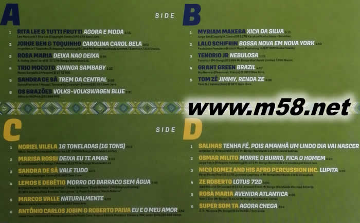 A1。麗塔·李和圖蒂·弗魯?shù)佟ぐ⒏昀つ_(dá)酒店 A2。Jorge Ben&Toquinho Carolina Carol Bela A3。羅莎·瑪麗亞·戴莎·娜奧·戴莎 A4。三重奏莫科托·斯溫加·桑巴比 A5。桑德拉·德斯特雷姆中央酒店 A6。Os Brazões Volks大眾藍(lán) B1。梅里亞姆·馬克巴·西卡·達(dá)席爾瓦酒店 B2。Lalo Schifrin Bossa Nova Em Nova York B3。小特諾里奧星云 B4。格蘭特綠色巴西 B5。湯姆·澤吉米,倫達(dá)·澤 C1。Noriel Villela 16噸(16噸) C2。Marisa Rossi Deixa Eu Te Amar C3。桑德拉·德薩維爾·圖多 補(bǔ)體第四成份。Lemos e Debétio Morro do Barraco SemÁgua C5。馬科斯·瓦勒·納圖拉門特 C6。Antônio Carlos Jobim&Roberto Paiva Eu E O Meu Amor D1。薩利納斯·特納哈·費(fèi)伊(Salinas Tenha Fé,Pois AmanhãUm Lindo Dia Vai Nasser) D2。奧斯馬爾·米利托·莫里·奧巴羅,菲卡·奧霍姆 D3。尼科·戈麥斯和他的非洲打擊樂器公司盧皮塔 D4。澤羅伯托蓮花72D D5。羅莎瑪麗亞大道大西洋酒店 D6。超級索姆塔阿戈拉車加酒店