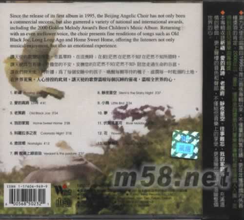 東方的天使之音 9 祈禱(m58.net) 作曲:T.H.Bayley、 Rentaro Taki、S.C.Foster 、Hays、塔 希格廷斯基、德弗乍克、史麥塔那、R.Bishop、德國民謠、簡銘耀等 合唱:北京天使合唱團 指揮:楊秀蘭 倪丹霞 東方天使合唱團自1995年推出首張專輯以來,不僅屢創銷售佳績,更年年獲得國內外各種獎項的肯定。2000年以「童年」獲得金曲獎最佳兒童樂曲專輯和最佳演唱人入圍,并得到最佳兒童樂曲專輯獎。本專輯收錄愛的真諦、祈禱、老黑爵、靜夜星空、往事難忘、我的家庭等充滿溫情的歌曲;更上層樓的音色和聲部,不僅給您音樂上的享受,更溫暖您的心,溫暖整個世界的心。