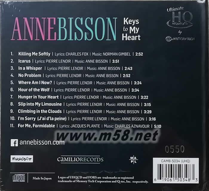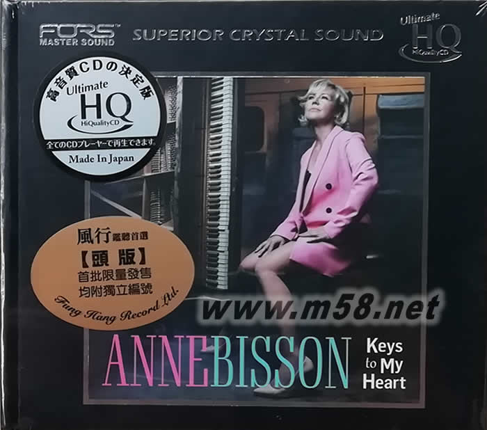 我心之鑰 Keys To My Heart (UHQCD) UHQCD 限量頭版(m58.net) 加拿大歌手Anne Bisson,從小學琴,11歲即展現作曲的天賦,她的專輯大部份自己包辦曲子的創作。Anne Bisson的歌聲甜美圓潤、溫暖厚實,發行的專輯也都是發燒級的錄音,各種樂器的錄音效果非常突出,無論是大提琴、鋼琴、低音貝斯所演奏的高低音頻,彷彿有親臨現場一般的質感,天籟般的歌聲,一流伴奏,以及頂尖錄音的享受,造就了爵士女伶Anne Bisson廣受發燒友和爵士迷的忠實愛戴。 2019年8月,一年一度的Hi-End國際音響大展,主辦協會特邀Anne Bisson在圓山飯店展場1樓大廳演唱和販賣一張1千多元的高音質UHQCD專輯,演唱會后現場辦理簽名會,Anne Bisson從國外帶到現場的最新UHQCD專輯『我心之鑰』被發燒友搶購一空,很多樂迷還欲罷不能駐足現場,享受著爵士女伶Anne Bisson甜美溫暖歌聲之余音繚繞,三日不絕的饗宴! 如果你想挑一張好聽,以及錄音非常棒的爵士經典發燒專輯收藏的話,Anne Bisson將是你最好的選擇。