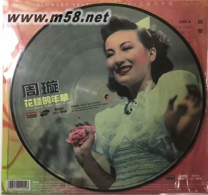 周璇 花樣的年華 彩膠 黑膠(m58.net) 有"金嗓子" 美譽之稱的周璇是1930年代至1940年代著名歌星、影星,有「金嗓子」、「歌后」和「影后」之稱。這位充滿上海風情與氣息的流行曲歌后,瘋魔整個華人樂壇。本專輯特選周璇經典名曲,讓樂迷能再次回味”金嗓子”歌后的獨特風釆,演繹多首不朽名曲包括 [天涯歌女]、[永遠的微笑]、[莫負青春]、[陋巷之春]、[訴衷情] 及 [晚安曲]等。