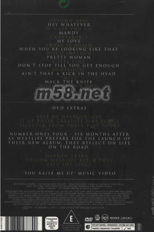 UPTOWN GIRL HEY WHATEVER IF I LET YOU GO MANDY UNBREAKABLE MY LOVE SWEAR IT AGAIN WHEN YOU'RE LOOKING LIKE THAT DISCO INFERNO PRETTY WOMAN I FEEL FINE DON'T STOP TILL YOU GET ENOUGH FOOTLOOSE AIN'T THAT A KICK IN THE HEAD SMILE MACK THE KNIFE WORLD OF OUR OWN WHAT MAKES A MAN FLYING WITHOUT WINGS DVD EXTRAS BEST OF WESTLIFE LIVE 11 OF THEIR GREATEST LIVE SONGS SELECTED FROM THEIR PAST TOURS NUMBER ONES TOUR-SIX MONTHS AFTER AS WESTLIFE PRERARE FOR THE LAUNCH OF THEIR NEW ALBUM,THEY REFLECT ON LIFE ON THE ROAD. HIDDEN EXTRA- FOLLOW WESTLIFE AFTER THEY EXIT THE STAGE "YOU RAISE ME UP" MUSIC VIDEO + BRILLIANT RAT PACK SECTION + AMAZING VIDEO FOR"YOU RAISE ME UP" + "BEST OF WESTLIFE"FROM PREVIOUS TOURS(11 SONGS!!)