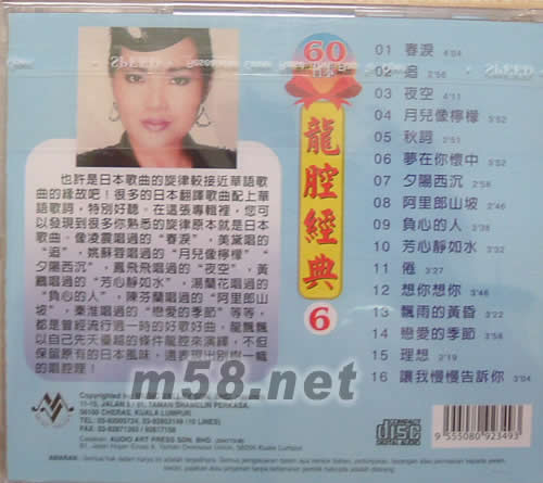 龍腔經典(6)60年代日本譯曲(m58.net) 也許是日本歌曲的旋律較接近華語歌曲的緣故吧!很多的日本翻譯歌曲配上華語歌詞,特別好聽。在這張專輯里,您可以發現到很多你熟悉的旋律原本就是日本歌曲。像凌震唱過的"春淚",美黛唱的"追",姚蘇蓉唱過的"月兒像檸檬""夕陽西沉",鳳飛飛唱過的"夜空",黃鸝唱過的"芳心靜如水",湯蘭花唱過的"負心的人",陳芬蘭唱過的"阿里郎山坡",秦淮唱過的"戀愛的季節"等等,都是曾經流行過一時的好歌好曲,龍飄飄以自己先天優越的條件龍腔來演繹,不但保留原有的日本風味,還表現出別樹一幟的唱腔哩!