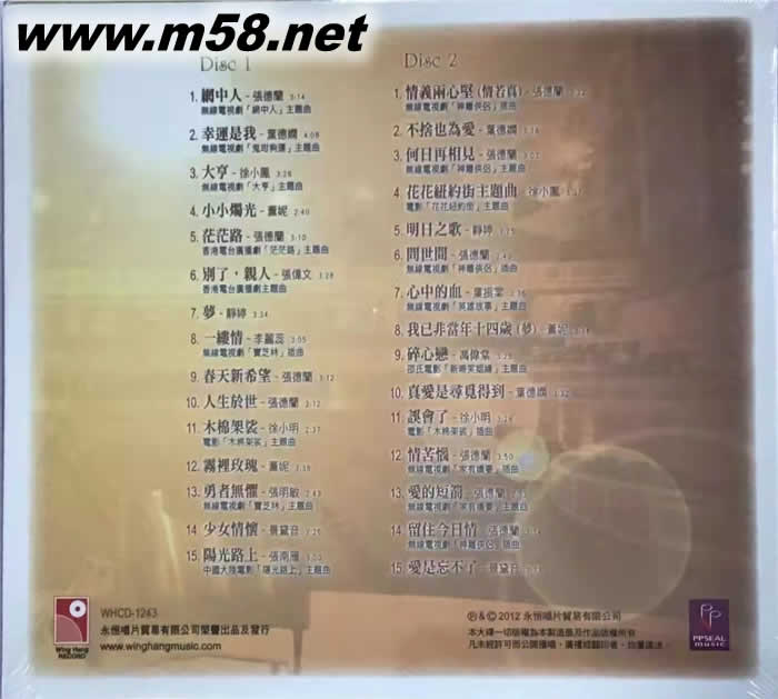 Disc 1 1. 網中人 - 張德蘭[無線電視劇 "網中人" 主題曲] 2. 幸運是我 - 葉德嫻[無線電視劇 "鬼咁夠運" 主題曲] 3. 大亨 - 徐小鳳 [無線電視劇 "大亨"主題曲] 4. 小小燭光 - 薰妮 5. 茫茫路 - 張德蘭[香港電臺廣播劇 ”茫茫路” 主題曲] 6. 別了 , 親人 - 張偉文 [香港電臺廣播劇主題曲] 7. 夢 - 靜婷 8. 一縷情 - 李麗蕊 [無線電視劇 “寶芝林”插曲] 9. 春天新希望 - 張德蘭 10. 人生於世 - 張德蘭 11. 木棉袈裟 - 徐小明 [電影 "木棉袈裟" 主題曲] 12. 霧裡玫瑰 - 薰妮 13. 勇者無懼 - 張明敏[無線電視劇 “寶芝林”主題曲] 14. 少女情懷 - 景黛音 15. 陽光路上 - 張南雁[中國大陸電影”陽光路上”主題曲] Disc 2 1. 情義兩心堅(情若真) - 張德蘭[無線電視劇 "神雕俠侶" 插曲] 2. 不捨也為愛 - 葉德嫻 3. 何日再相見 - 張德蘭[無線電視劇 "神雕俠侶" 主題曲] 4. 花花紐約街主題曲 - 徐小鳳[電影”花花紐約街”主題曲] 5. 明日之歌 - 靜婷 6. 問世間 - 張德蘭[無線電視劇 "神雕俠侶" 插曲] 7. 心中的血 - 葉振棠[無線電視劇"英雄故事"主題曲] 8. 我己非當年十四歲 (夢) - 薰妮 9. 碎心戀 - 馮偉棠[邵氏電影”新啼笑姻緣”主題曲] 10. 真愛是尋覓得到 - 葉德嫻 11. 誤會了 - 徐小明[電影 "木棉袈裟" 插曲] 12. 情苦惱 - 張德蘭[無線電視劇 "家有嬌妻" 插曲] 13. 愛的短箭 - 張德蘭 [無線電視劇 "家有嬌妻" 主題曲] 14. 留住今日情 - 張德蘭[無線電視劇 "神雕俠侶" 插曲] 15. 愛是忘不了 - 景黛音