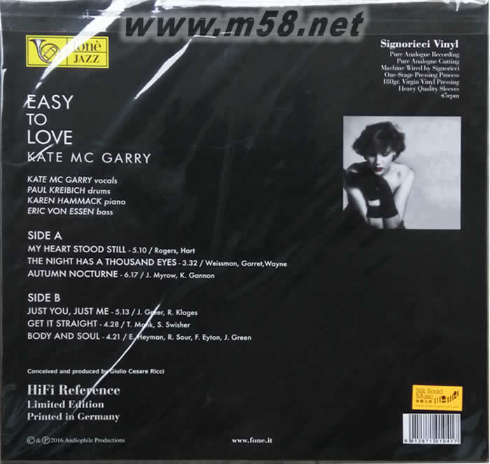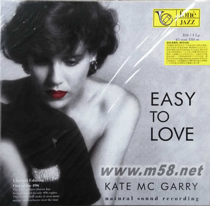 1. 於2008年獲得格萊美「年度最佳爵士樂歌曲專輯(Best Jazz Vocal Album)」提名的凱特•麥嘉妮(Kate McGarry)近期出版之SACD專輯【輕率地愛(Easy To Love)】獲得好評如潮,現精選專輯內六首名曲以45轉180克處女黑膠唱片為載體出版,效果更為突出。