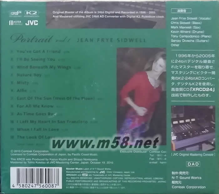 Combak Corporation (XRCD)(m58.net) 被譽為比爵士歌手更爵士的女歌手的Jean Frye Sidwell,擁有幾近完美中低音域。她的聲線如綢緞般柔滑,聲底暗部層次分明,聆來令人欲醉,與爵士及靈魂歌曲的搭配可說天衣無縫。 這位出生于美國南卡羅萊納,成名于洛杉磯,演唱生涯已超過25年的美聲一姐,想必喜歡聽爵士和人聲的朋友應該不會陌生。 她濃纖合度的甜潤聲線,呈現無限贊嘆的甜美氛圍,歌聲聽來更加悅耳迷人