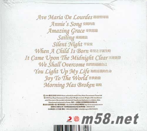 01. Ave Maria De Lourdes (路德圣母頌) 02. Annie's Song (安妮的歌) 03. Amazing Grace (奇異恩寵) 04. Sailng (乘風破浪) 05. Silent Night (平安夜) 06. When A Child Is Born (希望之子誕生時) 07. It Came Upon The Midnight Clear (天使歌聲) 08. We Shall Overcome (我們將超越自己) 09. You Light Up My Life (你照亮我的生命) 10. Joy To The World (普世歡騰) 11. Morning Has Broken (破曉)