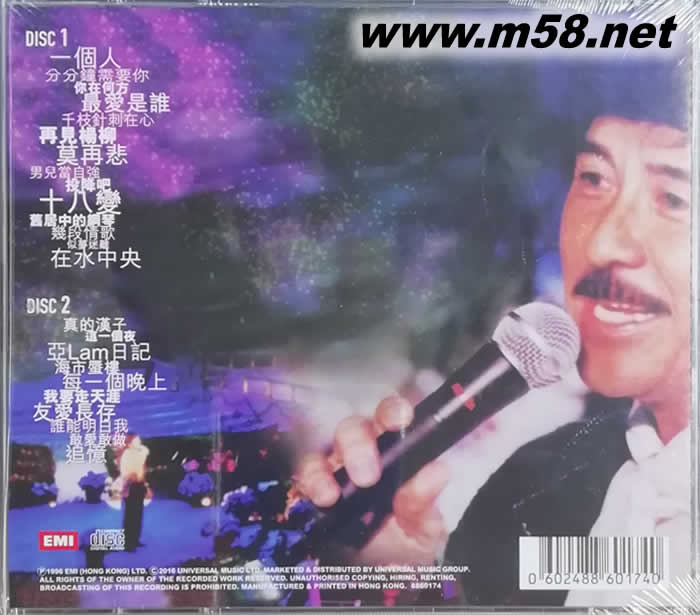 CD1 01.一個人 02.分分鐘需要你 03.你在何方 04.最愛是誰 05.千枝針刺在心 06.再見楊柳 07.莫再悲 08.男兒當自強 09.投降吧 10.十八變 11.舊居中的鋼琴 12.幾段情歌 13.似夢迷離 14.在水中央 CD2 01.真的漢子 02.這一個夜