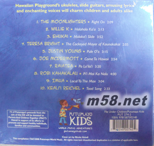 夏威夷歡樂派對Hawaiian Playground(m58.net) 收錄最純正最接近渡假天堂的閒散輕柔歡樂聲音 夏威夷地處南太平洋波里尼西亞群島最北端,深受波里尼西亞傳統文化影響,在二十世紀之前是以類似教堂唱詩班的合聲(Mele),以鯊魚皮製的手鼓(Pahu)敲打出節奏,配合草裙舞者祈禱動作(Hula)的Mele Hula Pahu為主要音樂,直到二十世紀初期由一位歐胡島的音樂家創造了一種快速在鋼弦上滑動手指,能彈出輕盈閒散風格,更符合當地渡假風情的吉他彈奏法Slack Key之后,夏威夷音樂才真正有了屬於自已的特色。到五十年代又出現了Steel Guiter(夏威夷鋼弦吉他),能彈奏出更明顯的滑音效果,很快的便風靡美國本土,當時正值爵士樂發展時期,Slack Key也吸取了爵士樂的Rag Time(碎步)節奏,之后樂風又再融合了Reggae(雷鬼)、Folk(民謠)與流行元素后,才逐漸演化出目前的多樣風貌。 Slack Key可以單獨演唱演奏,通常會配合草群舞表演,和著輕盈的旋律,唱著熱情的歌,大伙一起與草裙舞女郎扭動著身軀,立刻就能感受到濃濃的歡樂派對氣氛,這正是讓所有觀光客過目不忘,一聽到就能快樂的夏威夷音樂。世界音樂大廠Putumayo終於在全球期盼下,推出第一張以夏威夷歡樂為主題的選輯,收錄夏威夷當地及美國最能製造歡樂氣氛的夏威夷演唱歌曲,包括來自紐約以英語演唱的輕爵士樂隊The Moonlighters,及生於夏威夷音樂世家以波里尼西亞土著語言演唱的才子Willie K,重現了Slack Key初期融合爵士樂風光時期Rag Time輕快節拍;而Ehukai當紅人氣男星Ehukai、在波士頓教授優克里里琴及夏威夷鋼弦吉他大師Robi Kahakalau,及獲夏威夷最佳新進藝人獎提名的Imua,都不約而同貢獻了融合雷鬼慵懶風情的歡樂作品,輕柔閒散的Slack Key加上本來就很慵懶的雷鬼搖擺節奏,舒服指數百分百;另外從Justin Young及Raiatea兩位男女藝人完全以土語演唱的快樂歌聲中,可以感受到草裙舞女郎隨樂擺動的自由自在,這正是吸收全世界最純正最接近渡假天堂的聲音。