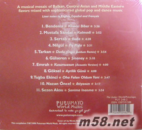 Turkish Groove 時尚舞曲精選系列 (8) 舞動土耳其 曲目(m58.net) 傳統土耳其樂器齊特琴、魯特琴、手鼓與時尚節拍完美結合,威震巴爾干、中東、北非、土耳其巨星作品全收錄! 世界音樂名廠Putumayo的作品中,除了Lounge 時尚沙發系列之外,就屬Groove 時尚舞曲精選系世界音樂名廠Putumayo的作品中,除了Lounge 時尚沙發系列之外,就屬Groove 時尚舞曲精選系列最受全球樂迷歡迎了。當Hip-Hop(嘻哈)、Techno(科技)、Electronica(電音)、R&B(節奏藍調)、House(浩室)、Funk(放克)等這些時尚前衛舞曲節拍,隨著英美主流舞曲攻陷全球大小舞場之后,逐漸與各地區民族特有的節奏與音樂結合,再加入以當地語言演唱及傳統樂器演奏編曲后,創造了不同地域風味的Groove。土耳其地處中東、東歐及北非的交界,自古來就是這三種文化衝擊之地,音樂上也集此三區精華之大成,在Groove上的發展更是執該區域之牛耳,足見其重要程度。 土耳其是世界上唯一跨越歐亞交界的國家,雖然當地放眼望去都是充滿古文明色彩的建筑物,但是土耳其卻是世界公認最摩登的回教國家,這樣的文化衝突之下,讓神秘色彩的土耳其流行音樂,反而成為最近市場上詢問度最高的音樂類型。 此輯收錄了威震歐洲、中東及北非各地的土耳其巨星精彩Groove代表作,熟悉的嘻哈、放克、電音等舞曲節拍,與當地傳統樂器Kanun(用音槌敲擊的齊特琴)、Saz(長頸魯特琴)、Darbuka(漏斗型手鼓)巧妙結合后,百分百的流行感覺中又夾著濃郁熱情的中東風味。講到土耳其流行樂就一定少不了風靡中東與歐洲的男星Tarkan,首張專輯就締造200萬銷售記錄,此輯收入的”Dudu”更是舞場必播冠軍曲;而受Tarken提攜一起合作創作的才女Nazan Oncel,也貢獻了一曲”Atiyosun”,此曲完美的展現多種土耳其傳統樂器魅力,搭配嘻哈節奏及土耳其式的饒舌,豐富熱鬧且經典;唯一可與Tarken抗衡的男偶像Mustafa Sandal在作品”Kalmadi”中展現了土耳其在吉普賽熱力的一面;另一首由老將Sezen Aksu演唱的”Sanima Inanma”也有異曲同工之妙;另外家喻戶曉女星Sertab、近期爆紅的Bendeniz及Gulseren的作品,熱情能量四射,實非凡人能擋,這就是土耳其的魅力。